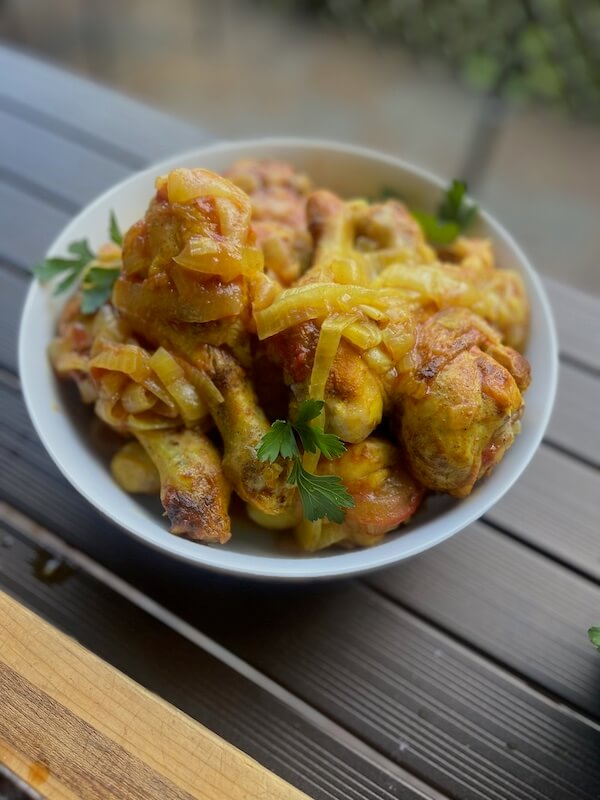 Golden Persian braised chicken with onions and tomato in white bowl