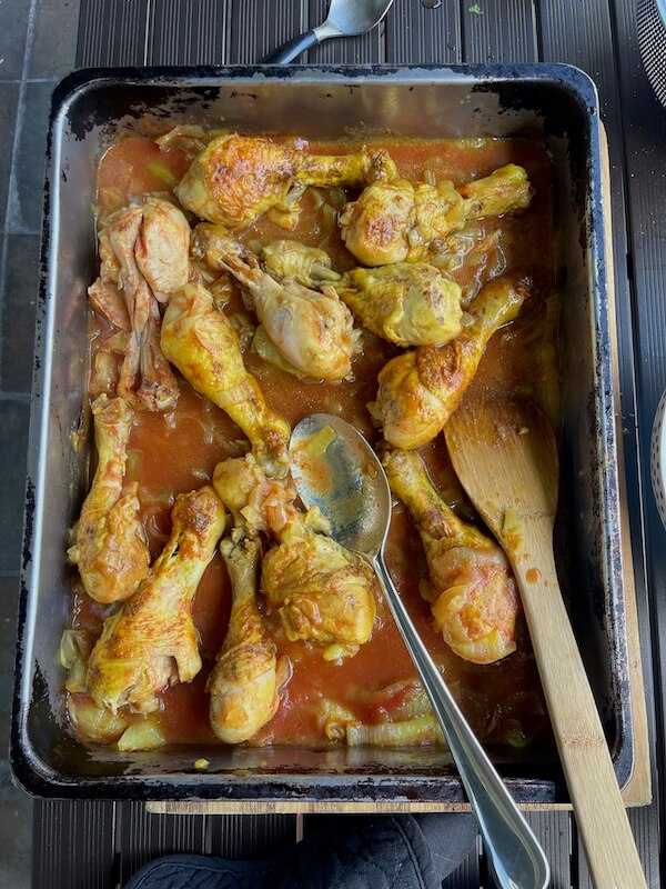 Braised Persian Chicken with onions and tomato in oven roasting pan